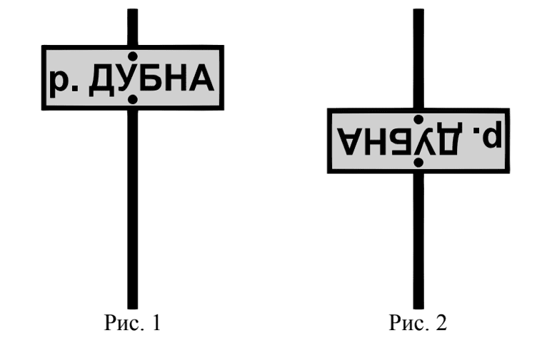 11. На столбе висела табличка (рис. 1). Верхний винт, державший табличку, выпал, и табличка перевернулась. Нарисуй, как будет выглядеть перевёрнутая табличка с надписью (рис. 2).