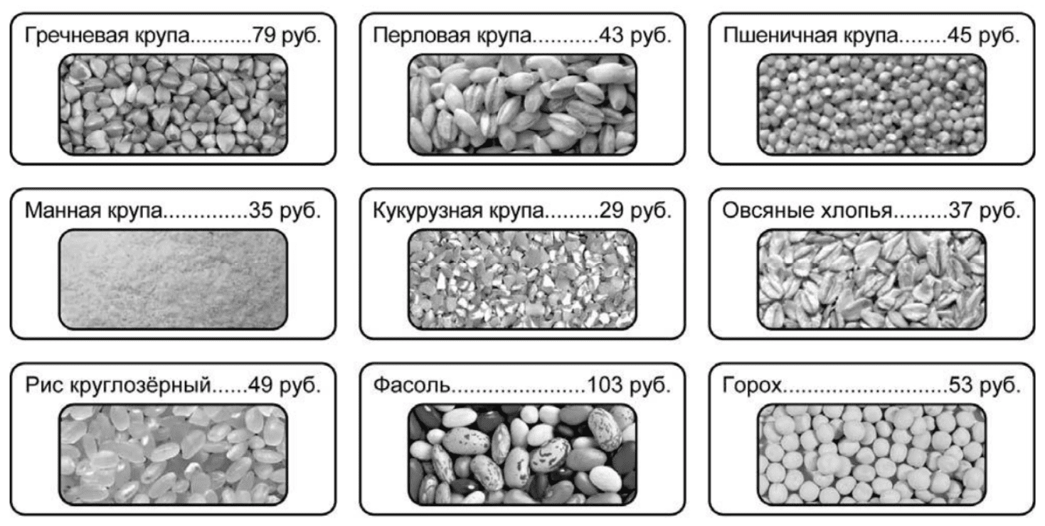 3. В магазине продаются бакалейные товары в упаковках. На рисунке показаны цены. Сколько всего рублей надо заплатить за две упаковки гороха и одну упаковку манной крупы?
