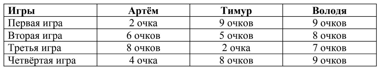 2) Кто из мальчиков набрал больше всего очков за все четыре игры?