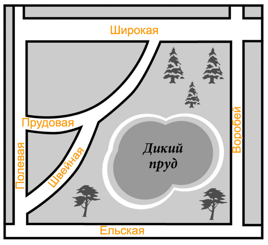 Любимое место отдыха наших горожан — парк, в центре которого раскинулся пруд с романтичным названием Дикий. Рядом с парком недавно появились два новых жилых квартала. Если посмотреть на план города, то видно, что новые кварталы треугольные. Квартал поменьше — он называется «Парковый» — ограничен прямой как стрела улицей Полевой, а также двумя улочками поменьше — ул. Швейной и ул. Прудовой. Обе улочки старые и узкие, но при строительстве новых домов их привели в порядок и заасфальтировали. Прудовая длиннее Швейной. Она позволяет объехать перекрёсток Полевой и Широкой, где всё чаще скапливаются автомобильные пробки.
