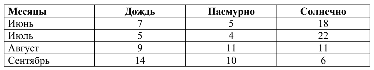 2) Каких дней (дождливых, пасмурных или солнечных) было в течение четырёх месяцев больше?
