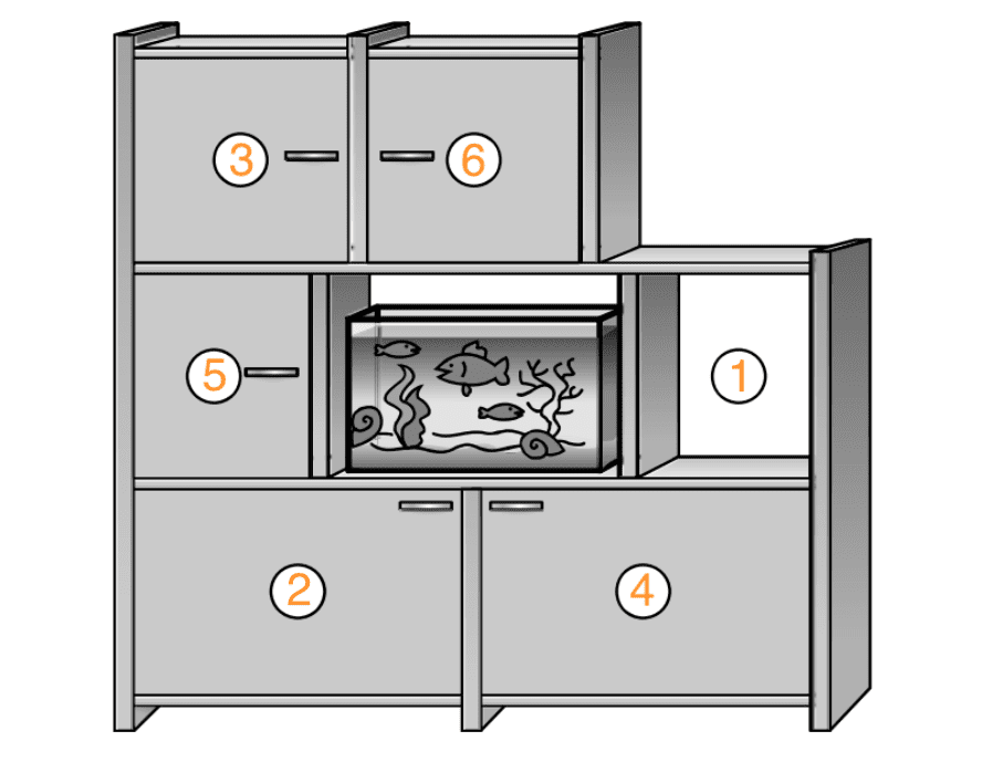 Меня зовут Слава. У нас дома стоит стеллаж. Все его отделы, кроме двух, закрываются дверками. В среднем, открытом отделе, стоит аквариум. Мне очень нравится сидеть напротив стеллажа на диване и смотреть на рыбок и улиток. Они очень забавные. Правее аквариума я положу мои школьные учебники и тетради. Оба верхних отдела стеллажа заняли папа и мама. В левом верхнем отделе лежат мамины книги. А во втором верхнем отделе, прямо над аквариумом, лежат книги, которые нужны папе для работы.