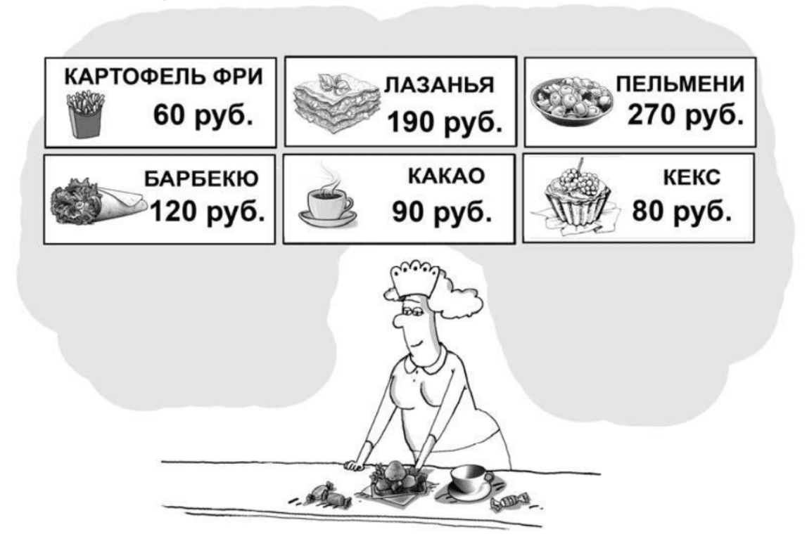 Картофель фри стоит 60 руб., барбекю — 120 руб., а какао — 90 руб. Весь завтрак стоит: 60 + 120 + 90 = 270 руб. Сдача составит 500 – 270 = 230 руб.