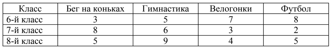 6. Среди школьников провели опрос «Твой любимый вид спорта». Результаты опроса показаны в таблице. Ответь на вопросы.