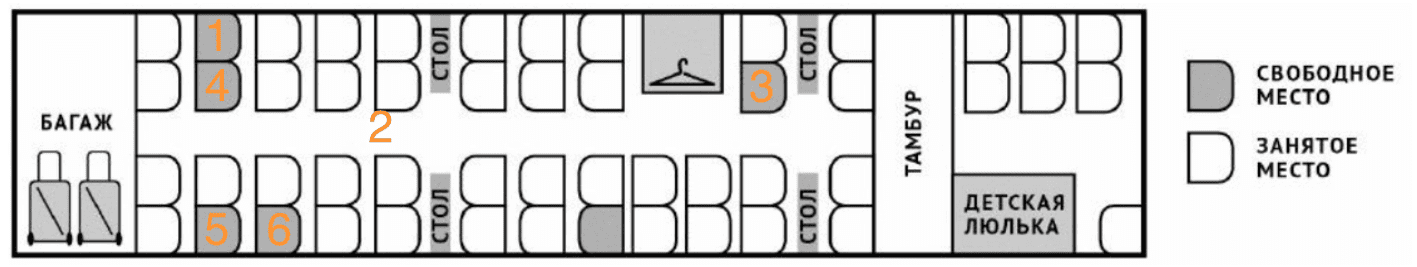Мы с папой сразу стали покупать в интернете билеты на скоростной поезд «Сапсан». Свободных мест было мало, хотя до поездки оставалось ещё две недели. Но всё-таки нашёлся вагон, где было ровно шесть свободных мест, что я и показал на схеме.