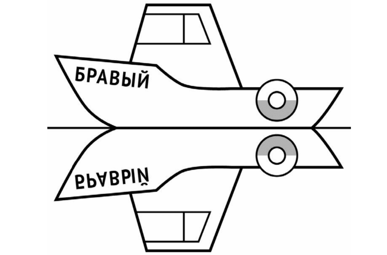 11. На рисунке изображён катер и его отражение в воде. На борту катера написано название «Бравый». Напиши название катера на отражении в воде.